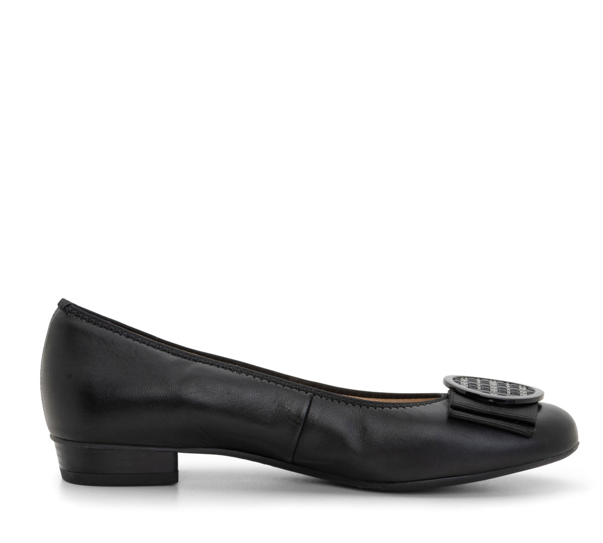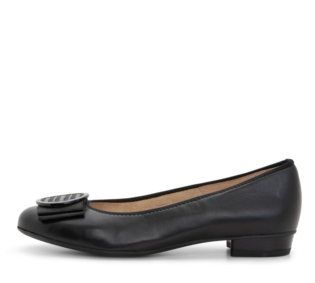 The Bambi in black by ara is a classic smart ballet flat that is ideal for everyday to evening. An elasticized topline creates a custom fit with added comfort. This chic flat features a metallic ornament, fabric bow trim, a rounded toe, and ara's HighSoft technology.