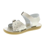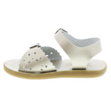Open-toe, open-heel leather sandal featuring true-buckle forefoot strap with decorative tear-drop perf design and hook-and-loop ankle strap with decorative buckle. Offered in matte, pearlized, and metallic colors; sizes ranging from 1.0 infant - 3.0 youth.